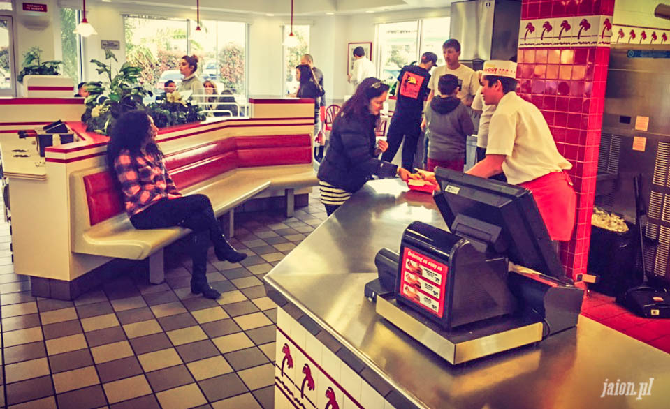 Jak wiadomo, w Ameryce można przebierać w fast food’ach. Co ciekawe, wśród naszych znajomych nikt nie je McDonalda i mamy wrażenie, że ta sieć już dawno przeszła do lamusa. Do wyboru jest wiele innych restauracji, które serwują kanapki bardziej przypominające hamburgery, z mięsem przygotowywanym na miejscu, warzywami krojonymi na miejscu, itd, itp. Jedną z nich jest In-N-Out, bardzo lubiana sieć serwująca burgery. Mówi się, że w In-N-Out mięso jest bardzo dobrej jakości, tak samo jak warzywa i frytki, które są krojone na miejscu.