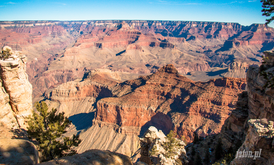 Wielki Kanion to nie prostopadła przepaść tak jak np. Horseshoe Bend, tylko mnóstwo skosów, dróżek, spadów i w końcu drzew i krzaków. Mieliśmy cień nadziei, że zatrzymał się gdzieś blisko przy naszej skale i nie potłukł za mocno. Spróbowaliśmy dostrzec go z innego puntku przez nasze obiektywy, ale nic z tego. Jedyne, co znaleźliśmy, to pumy i rodzinę jeleni. Zresztą nawet gdybyśmy go znaleźli, to jak go odzyskać?