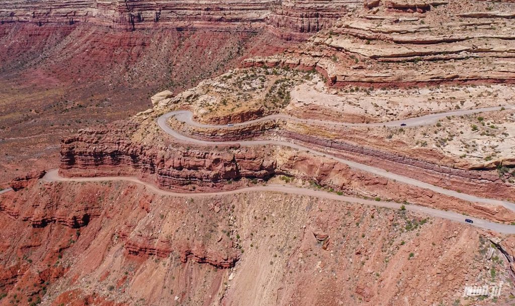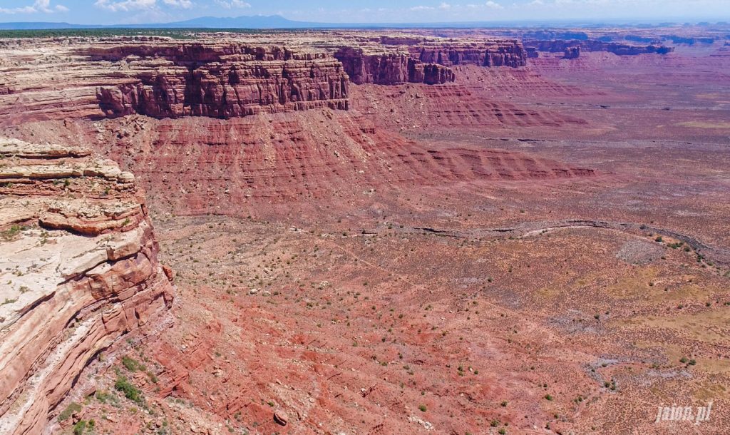 Następnie HIT wyjazdu. Tak jak UT-12 można sobie ewentualnie odpuścić, tak UT-261, którą odkryliśmy przypadkiem, nie wolno! Wybraliśmy ją, ponieważ prowadziła prosto z Natural Bridges do Monument Valley i nie wiedzieliśmy, co nas czeka. To, co na niej przeżyliśmy, to nasze! Z wygodnej, asfaltowej drogi, mniej więcej w 2/3 zmienia się w wąski, żwirowy pas prowadzący brzegiem czerownych, typowych dla Utah formacji. Mnogość wąskich, ostrych zakrętów i strome przepaści mogą zawrócić w głowie. Jest kilka punktów widokowych, w których można się zatrzymać. Jazda niskim kabrioletem może nie jest najbardziej wskazana, choć dzięki niemu widoki są jeszcze bardziej niesamowite. Jednak lepszy do podróży po Utah jest Jeep Wrangler lub inny terenowiec. Kuba latał dronem (schowany pod bluzą, by widział, co dzieje się na monitorze), ja robiłam zdjęcia. Poniżej są zarówno moje fotki jak i kadry z drona. Ta droga, którą widać, to jest właśnie wspominany fragment UT-261.